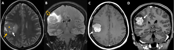 Hallazgos: Lesión isointensa al córtex cerebral localizada en zona subcortical anterior del lóbulo parietal derecho (*) con LCR separando su borde medial del parénquima adyacente (flechas blancas en A, C y D), correspondiente a signo de la hendidura de LCR. También se observan zonas de desplazamiento de sustancia gris sin expansión de sustancia blanca (flecha naranja en A). Estos hallazgos son indicativos de lesión extraaxial. No obstante, en secuencia FLAIR la lesión está casi completamente rodeada de edema vasogénico (flecha hueca en B) y tras la administración de contraste se visualiza captación intensa de contraste sin lograr demostrar conexión meníngea (ausencia de cola dural en imágenes C y D).