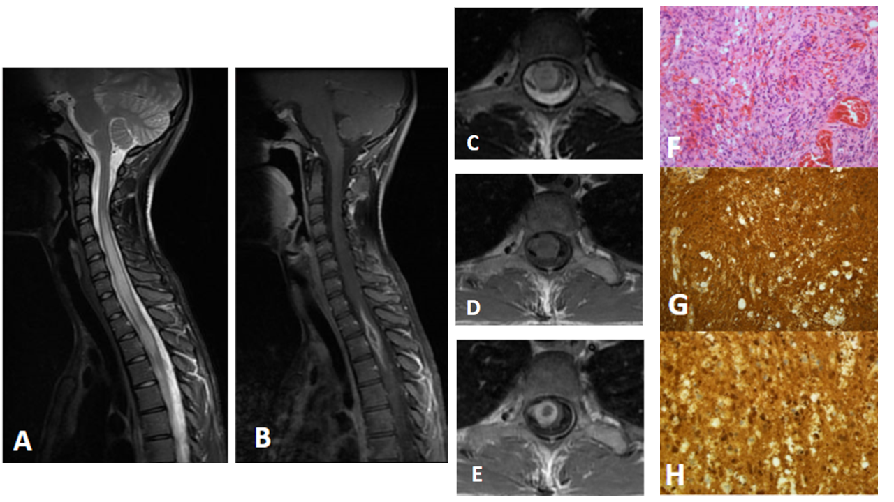 Hallazgos radiológicos: Cuando su ubicación es en la médula espinal, es un lesión de bordes bien delimitados, de localización intramedular y excéntrica, condicionado expansión de la médula. Es una lesión hipointensa en secuencias potenciadas en T1 y señal heterogénea en secuencias potenciadas en T2, con marcado realce tras la administración de gadolinio.