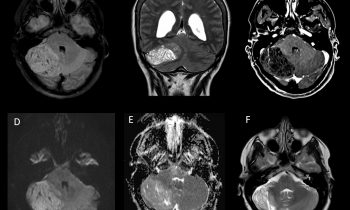 Figura 2 y 3: Masa heterogénea, de apariencia necrótico-multiquistica, con componente hemorrágico y áreas de calcificación intralesional. La lesión presenta zonas con aumento de la perfusión y captación de contraste, asociadas a una tenue restricción a la difusión. La lesión se encuentra centrada en la línea media y parece tener su origen a nivel intraventricular. Condiciona cambios de hidrocefalia con dilatación asimétrica de los ventrículos laterales e importante efecto de masa con desplazamiento hacia anterior de las estructuras meséncefalo-diencefálicas, así como colapso de cisternas basales y tercer ventrículo.